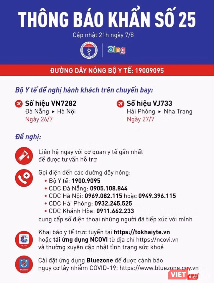 VietTimes – Bộ Y tế vừa phát đi thông báo khẩn số 25 tìm hành khách trên chuyến bay VN7282 từ Đà Nẵng đến Hà Nội ngày 24/7 và chuyến bay VJ733 từ Hải Phòng đi Nha Trang ngày 27/7.
