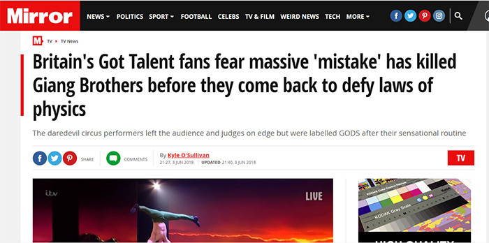 | "Tôi nói chung không xem Britain's Got Talent vì biết rằng nó có nhiều sắp đặt, nhưng màn trình diễn của các cậu bé họ Giang thực sự đáng kinh ngạc" |