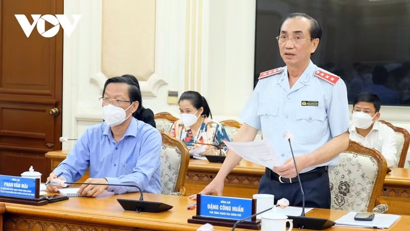 Phó Tổng Thanh tra Chính phủ Đặng Công Huẩn công bố quyết định thanh tra việc mua sắm trang thiết bị, vật tư, sinh phẩm, kit test xét nghiệm, vaccine, thuốc phòng, chống dịch COVID-19 tại TP.HCM, ngày 20/1. (ảnh: Hà An)