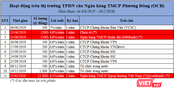 Theo thống kê của VietTimes, trong giai đoạn từ 6/6/2019 - 10/2/2020, Ngân hàng TMCP Phương Đông (OCB) hoạt động khá tích cực trên thị trường trái phiếu doanh nghiệp, với tổng cộng 11 đợt phát hành riêng lẻ và mua lại trái phiếu trước hạn được công bố.