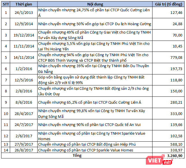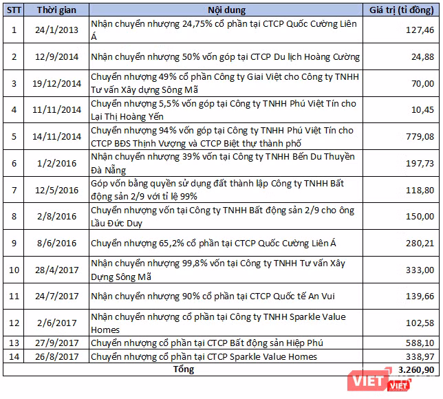 Ở một thương vụ khác, tháng 6/2016, HĐQT QCG thông qua việc chuyển nhượng 65,2% vốn góp, tương đương 16,3 triệu cổ phần CTCP Quốc Cường Liên Á (Quốc Cường Liên Á) cho 3 thể nhân với giá chuyển nhượng 280,2 tỉ đồng, ghi nhận khoản lỗ khoảng 30 tỉ đồng từ thương vụ này. Một trong những thể nhân nhận chuyển nhượng cổ phần Quốc Cường Liên Á từ QCG là bà Lại Thị Hoàng Yến - con gái Chủ tịch HĐQT QCG Lại Thế Hà.