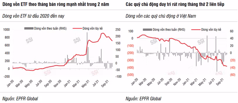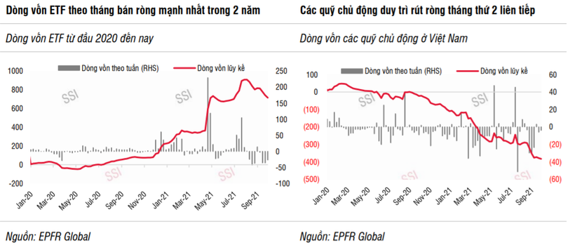 Theo SSI, dòng tiền đầu tư có xu hướng tiêu cực trong thời gian qua khi sức hấp dẫn của thị trường chứng khoán Việt Nam giảm sút đến từ nhiều lý do khách quan và chủ quan. Tâm lý nhà đầu tư bị ảnh hưởng nghiêm trọng khi hoạt động sản xuất, đặc biệt là chuỗi cung ứng bị đứt gãy (xuất khẩu tháng 8 giảm 1,7%, trong khi các quốc gia trong khu vực đều tăng trưởng 2 chữ số).