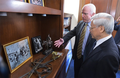 Ông McCain tiếp đón thân mật Tổng Bí thư Nguyễn Phú Trọng trong phòng họp của Ủy ban Quân vụ Thượng viện do ông đang giữ ghế chủ tịch. Tuy nhiên trước đó, cựu ứng viên Tổng thống Đảng Cộng hòa đầy quyền lực đã đưa Tổng Bí thư vào văn phòng làm việc, thăm thú một vòng đầy ấn tượng, mà ông McCain đích thân làm người giới thiệu.