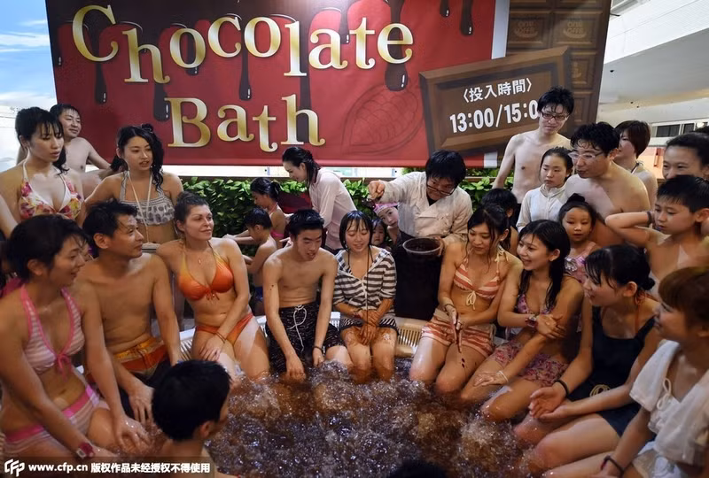 Ngày 8/2/2015, tại 1 suối nước nóng thuộc thành phố Kaganawa của Nhật Bản, khách du lịch tận hưởng giây phút thư giãn với chương trình tắm socola.