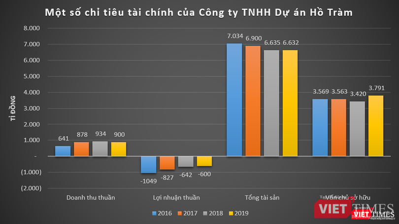 Cụ thể, năm 2016 và 2017, doanh thu thuần của Hồ Tràm lần lượt đạt 641 tỉ đồng và 878 tỉ đồng, lỗ thuần tương ứng ở mức 1.049 tỉ đồng và 827 tỉ đồng. Năm 2019, Hồ Tràm ghi nhận doanh thu đạt 900 tỉ đồng, báo lỗ thuần ở mức 600 tỉ đồng, trong khi năm 2018 lỗ 642 tỉ đồng.