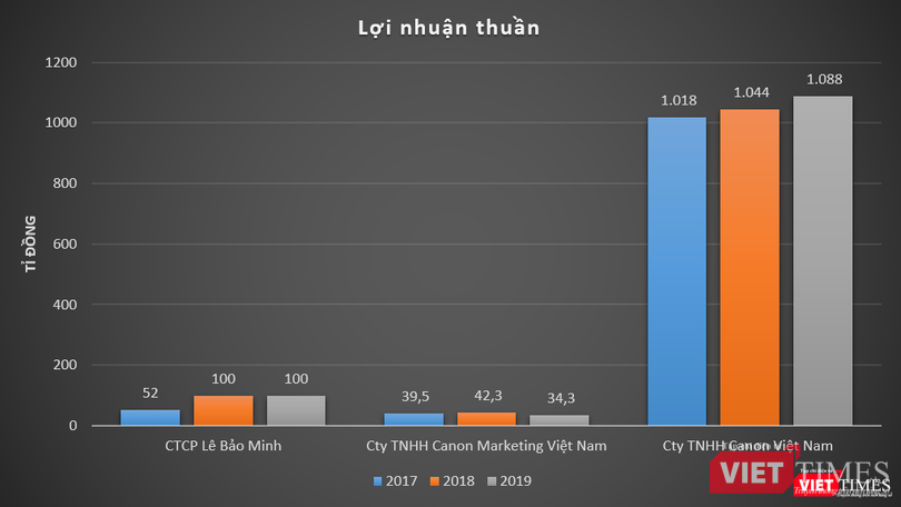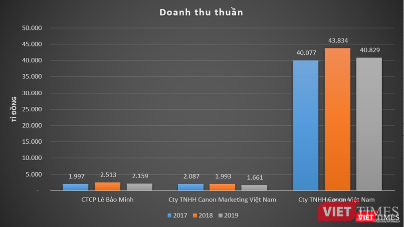 Dữ liệu của VietTimes cho thấy, trong giai đoạn 2017 – 2019, Canon Việt Nam (công ty mẹ) đều ghi nhận doanh thu trên 40.000 tỉ đồng, báo lãi thuần ở mức trên 1.000 tỉ đồng. Trong khi đó, Canon Marketing Việt Nam có doanh thu thuần hàng năm trên dưới 2.000 tỉ đồng, báo lãi thuần từ 30 – 40 tỉ đồng mỗi năm.
