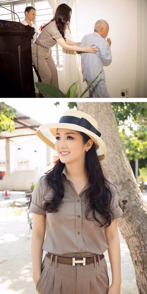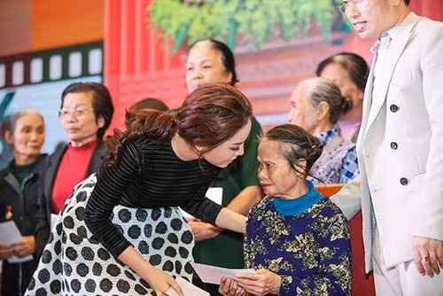 Á hậu Lệ Hằng cẩn thận che nắng cho em nhỏ và xách đồ giúp các cụ già
