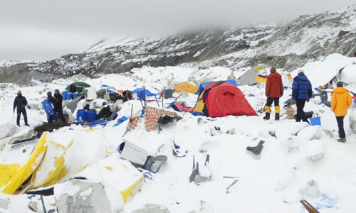 Một nhà leo núi giàu kinh nghiệm cho biết, Dan Fredinburg, nhà điều hành Google, bị tuyết cuốn ra xa khỏi khu trại leo núi ở Everest hàng chục mét, còn khu trại như thể "bị bom san phẳng".