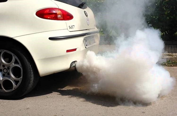 Nguyên nhân dẫn đến hiện tượng này có thể do gioăng nắp động cơ bị rò rỉ hoặc nắp động cơ nứt làm buồng đốt không được bịt kín khiến động cơ xăng đang đốt cháy nước làm mát hoặc dầu hộp số, cũng có thể nguyên nhân xuất phát từ động cơ đang nhận lấy “dầu đỏ” không hề mong muốn từ hộp số. Với xe chạy động cơ diesel, vấn đề có thể do kim phun làm việc không đúng thời điểm hoặc một trong các xylanh không đủ áp suất nén khiến nước làm mát đã lọt vào buồng đốt hoặc nhiên liệu không cháy sạch hoàn toàn.