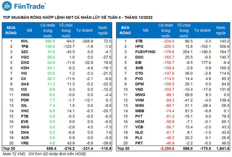 Nhà đầu tư cá nhân tiếp tục bán ròng 2.645 tỉ đồng trên HOSE. Tính riêng khớp lệnh họ bán ròng 2.508 tỉ đồng, nhiều nhất là STB (-234,5 tỉ đồng), HPG (-220,3 tỉ đồng), FUEVFVND (-178,6 tỉ đồng), DGC (-165,7 tỉ đồng), EIB (-158,7 tỉ đồng).