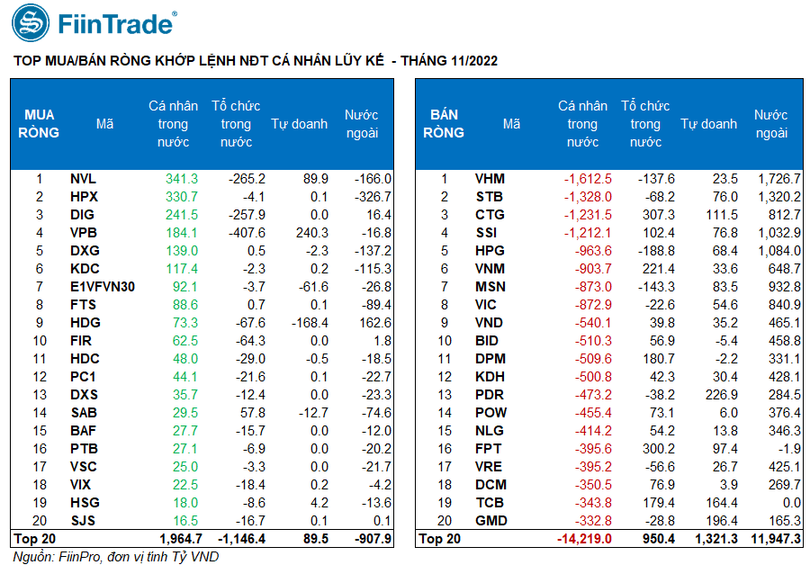 Trong tháng 11/2022, nhà đầu tư cá nhân bán ròng chủ yếu các mã VHM (-1.612,5 tỉ đồng), STB (-1.328 tỉ đồng), CTG (-1.231,5 tỉ đồng), SSI (-1.212,1 tỉ đồng), HPG (-963,6 tỉ đồng).