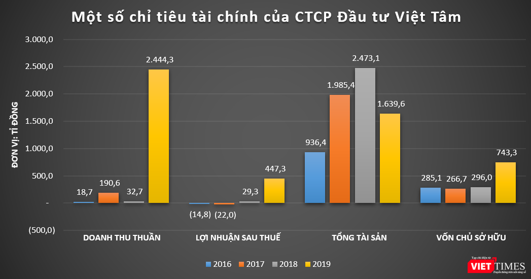 Dữ liệu của VietTimes cho thấy, kết quả kinh doanh của Việt Tâm có sự tăng trưởng mạnh vào năm 2019 với doanh thu thuần 2.444,3 tỉ đồng, lãi sau thuế 447,3 tỉ đồng, lần lượt cao gấp 74,7 lần và 15,2 lần so với năm 2018.