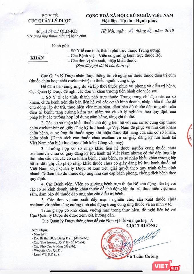 Cục Quản lý Dược yêu cầu các cơ sở nhập khẩu thuốc chủ động liên hệ với các cơ sở cung cấp thuốc chứa oseltamivir có giấy đăng ký lưu hành tại Việt Nam để phục vụ nhu cầu khám, chữa bệnh, cung ứng đủ thuốc ngay khi nhận được đặt hàng của các cơ sở khám, chữa bệnh.