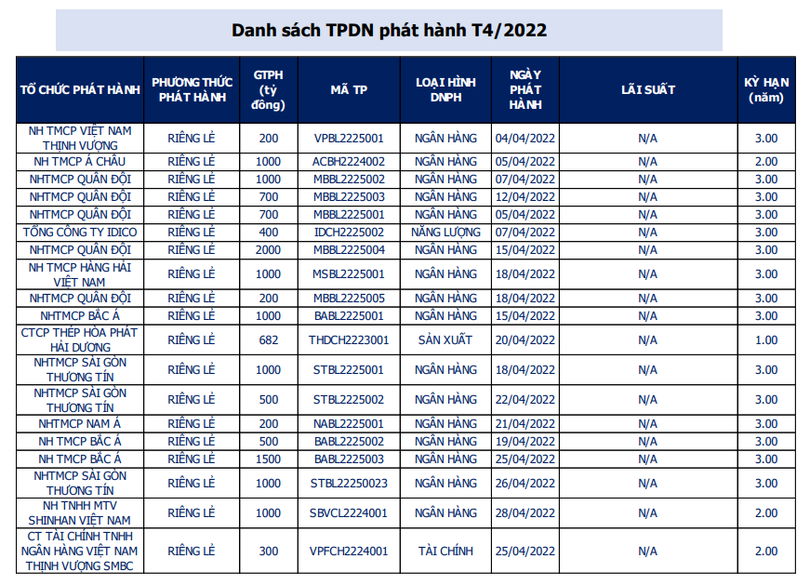 Trích dẫn số liệu từ Uỷ ban Chứng khoán Nhà nước (SSC) và Sở Giao dịch chứng khoán Hà Nội (HNX), Hiệp hội Thị trường Trái phiếu Việt Nam (VBMA) cho hay, trong tháng 4/2022, có 23 đợt phát hành trái phiếu riêng lẻ, với giá trị 16.472 tỉ đồng.