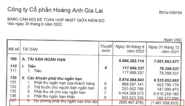 Tương ứng, trên bảng cân đối kế toán tại thời điểm ngày 30/06/2022, dự phòng phải thu ngắn hạn khó đòi đã giảm mạnh, chỉ còn 605 tỷ đồng – giảm 861 tỷ đồng so với thời điểm đầu năm. Trong năm ngoái, HAGL cũng hoàn nhập dự phòng hơn 1.000 tỷ để "thu gọn" con số dự phòng phải thu ngắn hạn khó đòi xuống gần 1.400 tỷ đồng so với hơn 2.300 tỷ đồng vào thời điểm đầu năm 2021. Đây chủ yếu là các khoản cho vay đối với nhóm công ty HAGL Agrico và các công ty liên quan khác của HAGL.