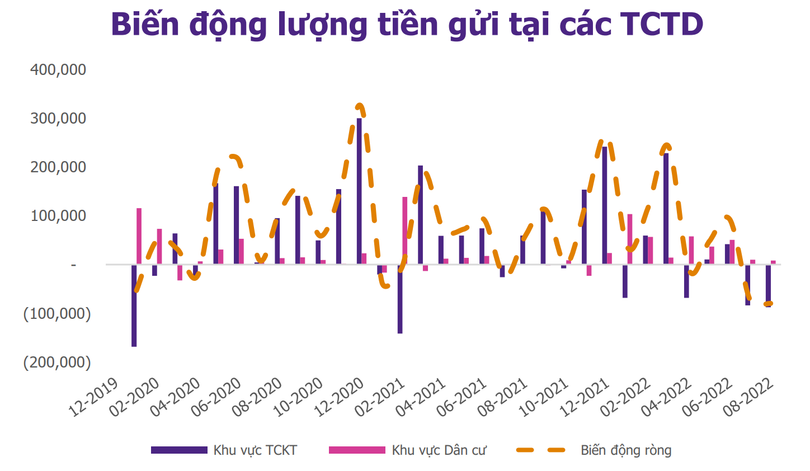Đáng chú ý, đi sâu vào cơ cấu biến động lượng tiền gửi tại các tổ chức tín dụng (TCTD), EVS nhận thấy khu vực tổ chức kinh tế có xu hướng rút ròng tiền gửi ra khỏi hệ thống. Trong khi đó, lượng huy động ròng khu vực dân cư trong các tháng 7 và 8/2022 chỉ ở mức 17.500 tỉ đồng.