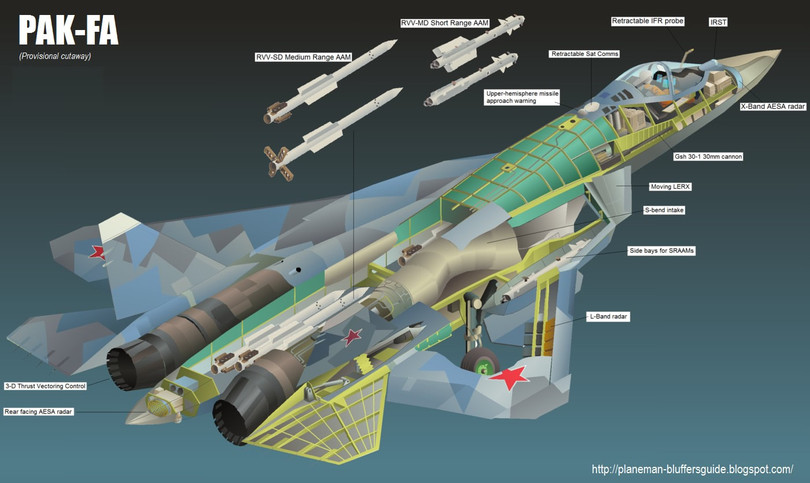 Máy bay tiêm kích đa nhiệm tàng hình thế hệ 5 PAK FA Т-50 Nga được phát triển bởi tập đoàn sản xuất máy bay Sukhoi. T-50 được thiết kể sử dụng các loại vật liệu composit mà thành phần cơ bản là sợi carbon, cho phép giảm thiểu tối đa khả năng phát hiện bằng radar.