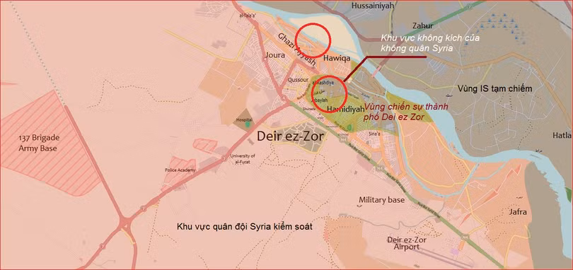 Ngày 22.11.2016, các lực lượng không quân Nga và Syria luân phiên ném bom dữ dội các vị trí IS trên hướng tây nam tỉnh Deir ez Zor, đánh phá nhiều mục tiêu của IS gần kho vũ khí Ayyash, quận Al-Haweeqa, đảo Sakr, quận Al-Rashidiyah, địa bàn sở chỉ huy của Lữ đoàn 137 pháo binh, vị tríIS đã chiếm được sau cuộc không kích man rợ của không quân liên minh quốc tế.