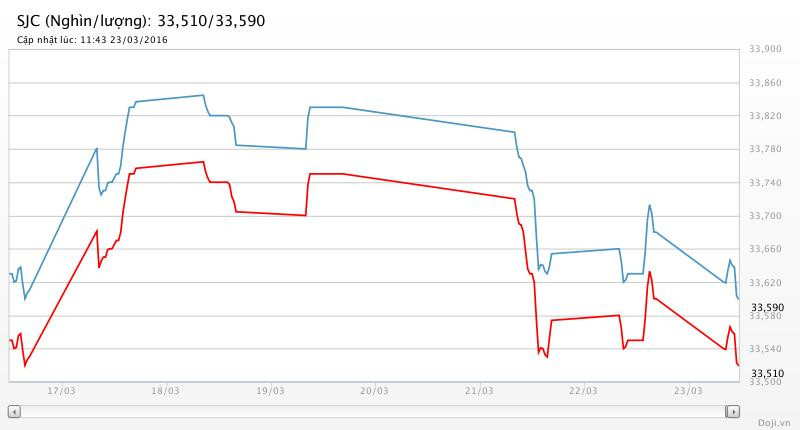 Tương tự, tại Doji, giá vàng miếng SJC lại được Tập đoàn điều chỉnh giảm 80 nghìn đồng về yết ở 33,52 – 33,60 triệu đồng/lượng (MV-BR) đối với giao dịch lẻ; và đắt hơn 10 nghìn đồng chiều mua, đồng thời rẻ hơn 10 nghìn đồng chiều bán đối với giao dịch buôn ở thị trường Hà Nội. Hiện, doãng chênh lệch 2 chiều mua-bán ở Doji vẫn là 80 nghìn đồng/lượng.