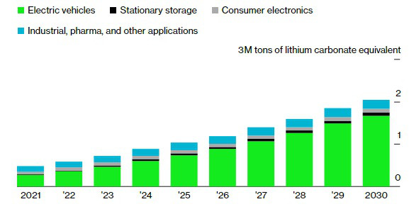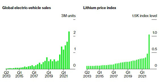 Nhu cầu đã vượt xa nguồn cung, đẩy giá lithium tăng 500% trong một năm. Tình trạng thiếu hụt lithium trầm trọng đến mức tại Trung Quốc – quốc gia sản xuất khoảng 80% pin lithium-ion toàn cầu, chính phủ đã yêu cầu các nhà cung cấp và sản xuất phải tìm cách hạ giá sản phẩm. Các nhà phân tích tại Macquarie Group cảnh báo về "tình trạng thâm hụt vĩnh viễn" trong khi Citigroup đã tăng gấp đôi dự báo về giá lithium cho năm 2022, cho rằng một cuộc "biểu tình" lớn của giá lithium có thể sắp xảy ra.