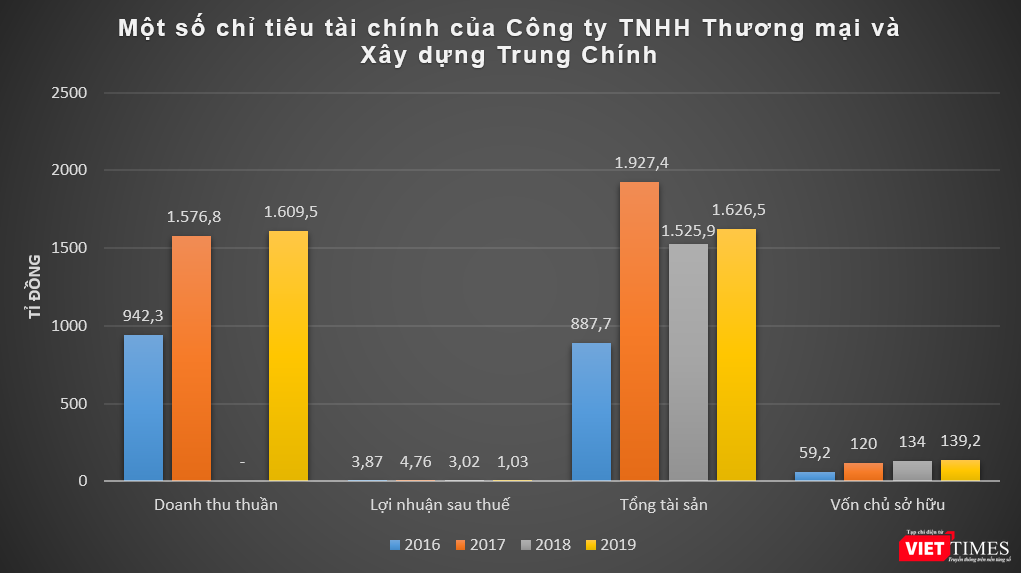 Dữ liệu của VietTimes cho thấy, hiệu suất sinh lời của Trung Chính (công ty mẹ) rất khiêm tốn. Như năm 2019, công ty này ghi nhận doanh thu thuần lên tới 1.609,5 tỉ đồng, tuy nhiên lãi sau thuế chỉ vỏn vẹn 1,03 tỉ đồng, tương ứng với biên lợi nhuận 0,06%.