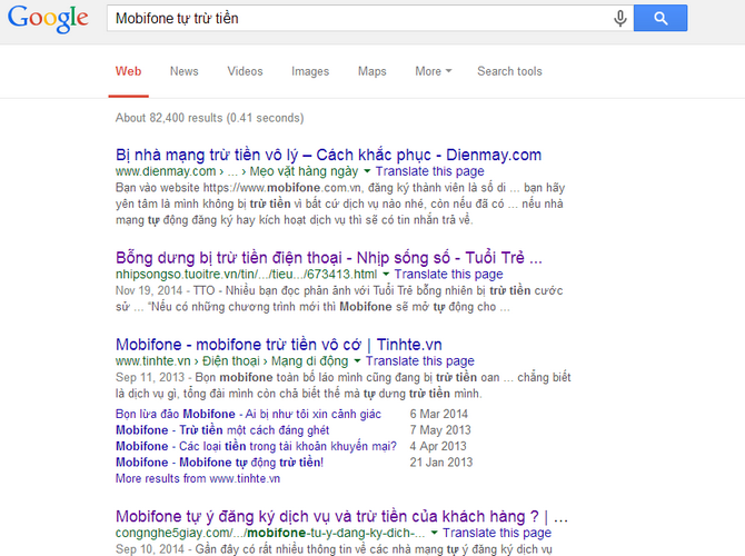 Theo thống kê của Google, có đến hơn 82.000 kết quả trên trang tìm kiếm này cho thấy việc “Mobifone tự trừ tiền” của khách hàng.