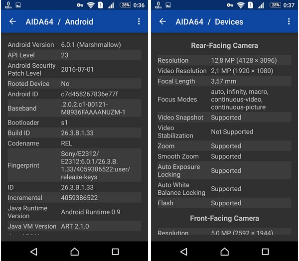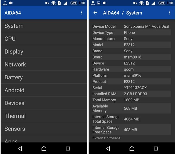 Ngoài ra Aida64 còn cung cấp công cụ để xem thông tin cấu hình chi tiết trên thiết bị. Tính năng này thực sự hữu dụng khi mua một chiếc smartphone cũ, bạn phải kiểm tra cấu hình chi tiết của thiết bị trước khi quyết định.