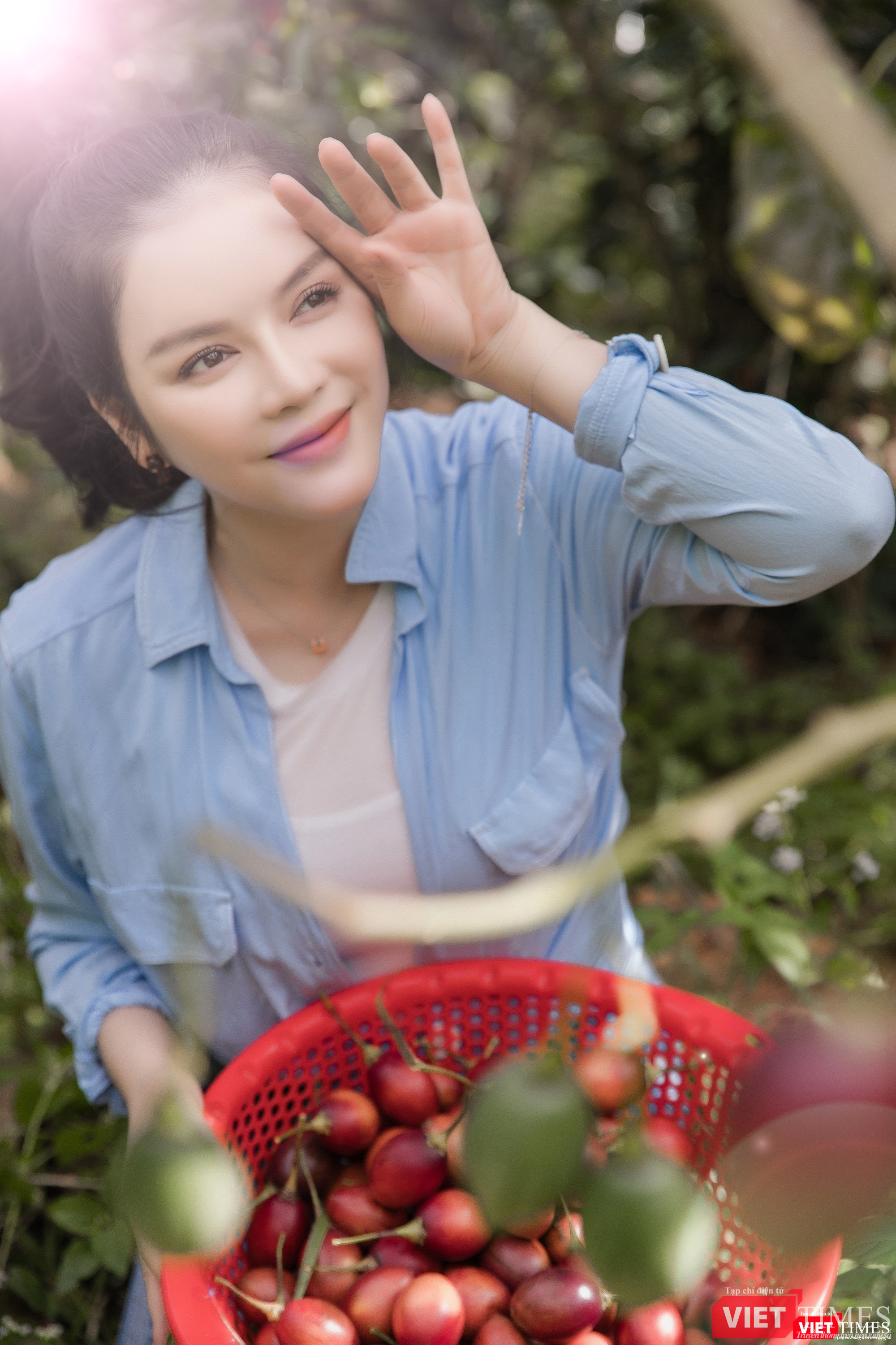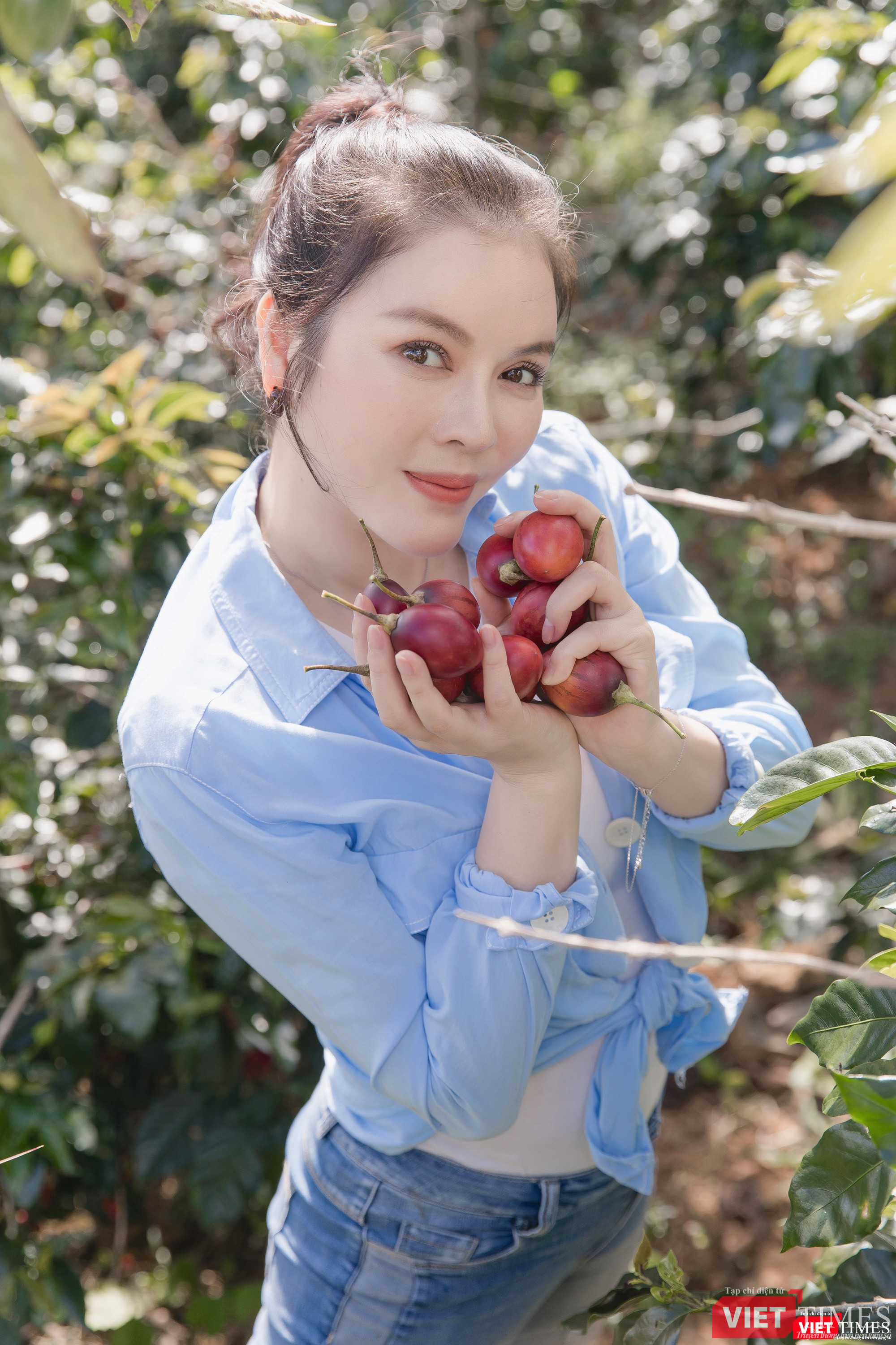 | Người đẹp thu hoạch được cả rổ cà chua thân gỗ |