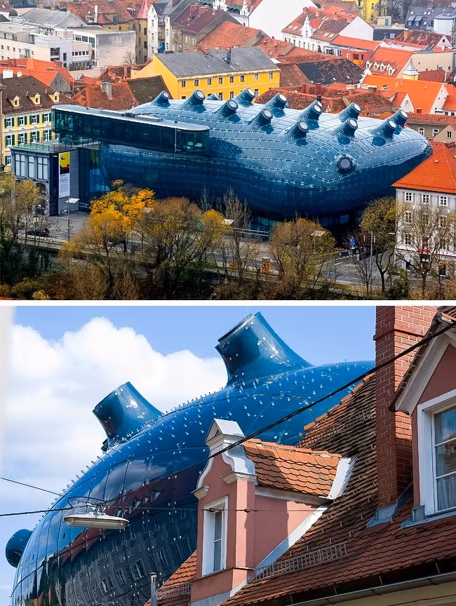 Bộ sưu tập nghệ thuật hiện đại này được gọi là "Người ngoài hành tinh thân thiện". Một số người thấy hình dạng tòa nhà giống trái tim của một con cá voi hoặc một khí cầu. Tòa nhà phát sáng lộng lẫy vào ban đêm. Kunsthaus phỏng theo phong cách sáng tạo của kiến trúc blob, một xu hướng mới trong thiết kế xây dựng hiện đại.