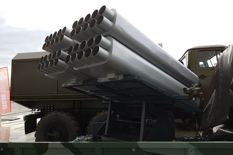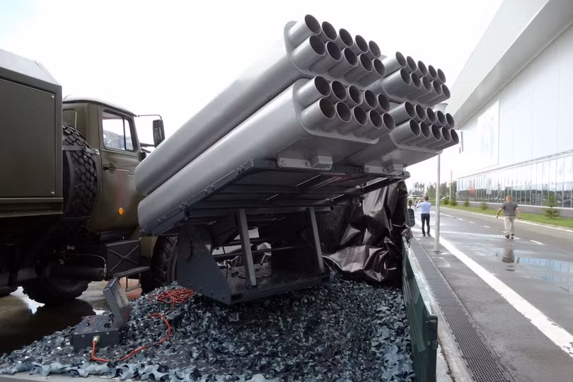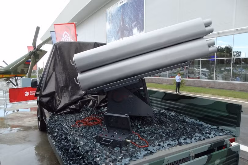 | Pháo phản lực hạng nhẹ 80 mm, 4 dàn phóng, 10 ống phóng mỗi dàn trên xe bán tải hạng nhẹ. Ảnh báo Rusian Gazeta |