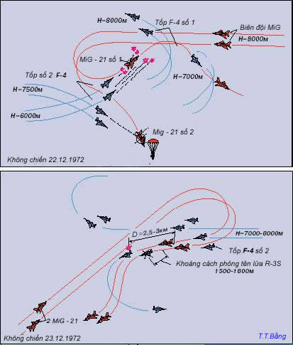 23.12. 13.41 từ sân bay Nội Bài, biên đội MiG 21 đã cất cánh đánh chặn cụm máy bay F- 4 từ hướng Lào vào Việt Nam trên độ cao 7000 – 8000 m. Thời tiết: mây mù cấp 10, chân mây 400m, trần mây 1200m, tầm nhìn xa từ 6 – 8 km. Dẫn đường từ sở chỉ huy trung đoàn. Sau khi cất cánh lấy độ cao 300 m, biên đội lấy đường bay góc dây cung 160 độ, sau 1,5 phút bay theo mệnh lệnh từ sở chỉ huy lấy đường bay góc dây cung 260 độ và tăng tốc độ cực đại chiếm độ cao.