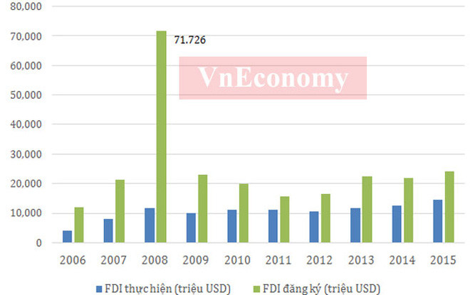Vốn FDI vào Việt Nam năm 2015, bao gồm vốn đăng ký và giải ngân, đã tăng khoảng 4 lần sau với năm 2006. Mức vốn FDI đăng ký trên 70 tỷ USD năm 2008 là mức cao nhất trong 10 năm qua trước hiệu ứng Việt Nam gia nhập WTO. Tuy nhiên, vốn FDI giải ngân năm 2008 ở mức khiêm tốn.