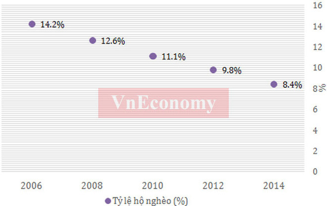 Tỷ lệ hộ nghèo ở Việt Nam liên tục giảm trong thời gian qua, và tới năm 2015 tỷ lệ hộ nghèo đã xuống dưới 5%, từ mức trên 14% năm 2006 - Nguồn: Tổng cục Thống kê.