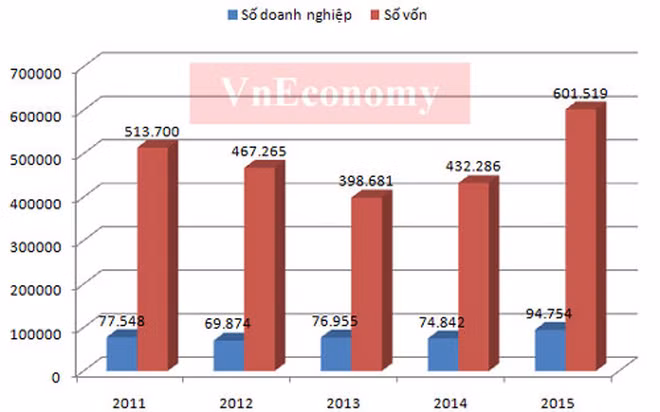 Số doanh nghiệp và số vốn giai đoạn 2011 - 2015 - Nguồn: Cục Quản lý đăng ký kinh doanh - Bộ Kế hoạch và Đầu tư.