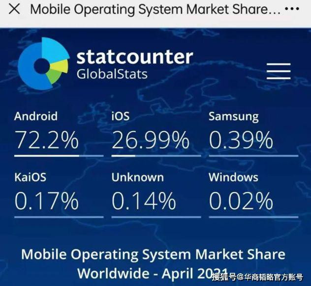Theo số liệu của StatCounter, từ tháng 4/2020 đến tháng 4/2021, Android chiếm 72,2% thị phần hệ điều hành di động, iOS chiếm 26,99%, và các hệ điều hành khác chỉ chiếm dưới 1% thị phần.