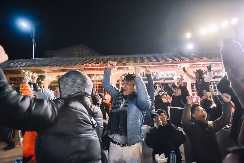 Sau 2 ngày lái xe vượt 500km, trong đó có 200km đường đèo cheo leo, hiểm trở, các thành viên đoàn Caravan vẫn tràn đầy nhiệt huyết. Quên đi cái lạnh gần 0 độ ở vùng biên ải lúc màn đêm buông xuống, 300 VinFaster đã hò reo “vang cả núi rừng” khi các tuyển thủ U22 liên tục sút tung lưới Campuchia.