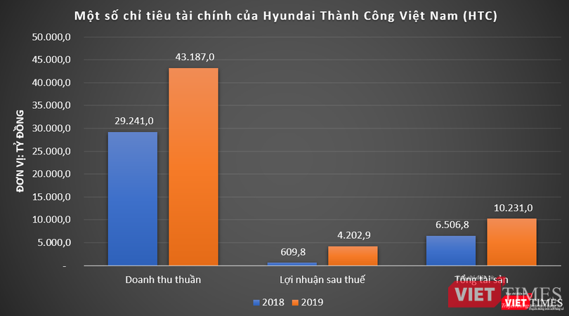 Hoạt động kinh doanh thuận lợi giúp Công ty Hyundai Thành Công Việt Nam (HTC) ghi nhận doanh thu thuần năm 2019 đạt tới 43.187 tỷ đồng, cao gấp 1,5 lần so với năm 2018. Lợi nhuận sau thuế của HTC cũng tăng vọt, đạt mức 4.202 tỷ đồng, cao gấp gần 7 lần so với năm 2018.