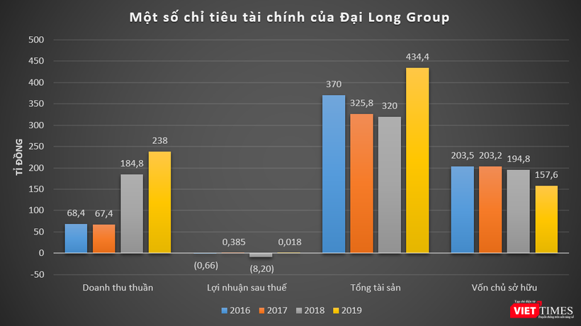 Dữ liệu của VietTimes cho thấy, trong giai đoạn 2016 - 2019, Đại Long Group chỉ báo lãi 2 lần vào năm 2017 và 2019 với tổng lãi sau thuế vỏn vẹn hơn 400 triệu đồng. Trong khi đó, riêng năm 2018 công ty này báo lỗ sau thuế hơn 8,2 tỉ đồng.