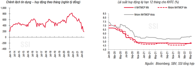 Nhóm phân tích cho rằng, áp lực tăng lãi suất huy động còn được thể hiện qua chênh lệch giữa tín dụng – huy động vốn đã giảm xuống mức thấp nhất trong vòng 8 năm nay. Số liệu từ NHNN cho thấy, tín dụng tính đến ngày 25/4 đã tăng 6,75% so với cuối 2021 (tương đương 16,4% so với cùng kỳ), trong khi huy động vốn chỉ tăng 3,55% (tương đương 10,7% so với cùng kỳ).