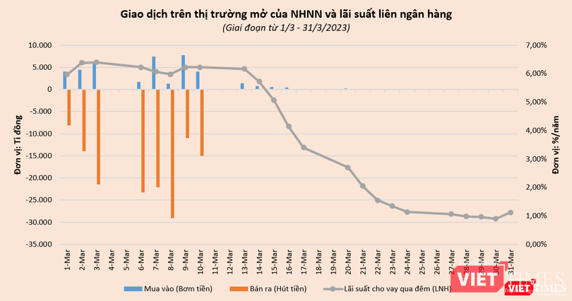 Diễn biến này tiếp tục kéo dài sang phiên giao dịch đầu tháng 4/2023, bất chấp động thái nâng kỳ hạn bơm tiền từ 28 ngày lên 35 ngày của NHNN với định hướng cung ứng thanh khoản dài hạn hơn cho hệ thống ngân hàng.