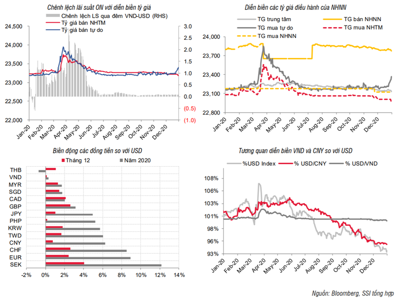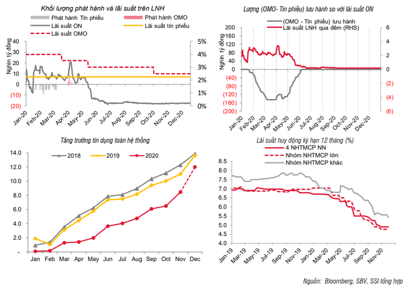 Tính chung cả năm 2020, Ngân hàng Nhà nước (NHNN) không bơm/hút ròng trên thị trường mở nhưng một lượng tiền đồng lớn được bơm vào thị trường thông qua hoạt động mua vào ngoại tệ. SSI cho rằng, nếu dự trữ ngoại hối cuối năm 2020 đạt 100 tỉ USD theo ước tính của Chính phủ thì lượng bơm tiền ròng từ NHNN đã tăng thêm khoảng 13% so với cùng kỳ.