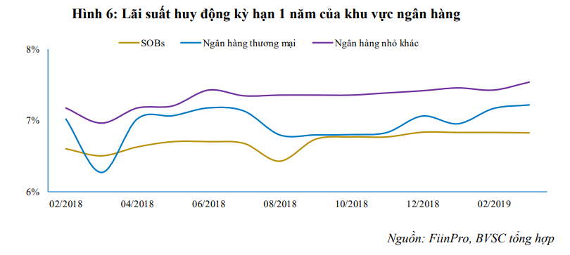 Điều này được phần nào biểu hiện khi lãi suất huy động của khu vực NHTM tăng nhẹ tại thời điểm cuối tháng 3 so với cuối tháng 2/2019.