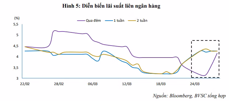 Theo BVSC, lãi suất liên ngân hàng trong tuần qua đối với kỳ hạn qua đêm tăng 1%, từ mức 3,15% lên 4,15%/năm. Kỳ hạn 1 tuần và 2 tuần cũng tăng lần lượt từ mức 3,2% và 3,4%, cùng đạt mức 4,25%/năm.