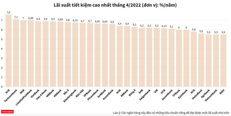 Mức lãi suất tiết kiệm cao nhất đang thuộc về SCB với 7,6%/năm. Tuy nhiên, khách hàng muốn nhận được mức lãi suất này cần phải gửi khoản tiền 500 tỷ đồng cho kỳ hạn 13 tháng...