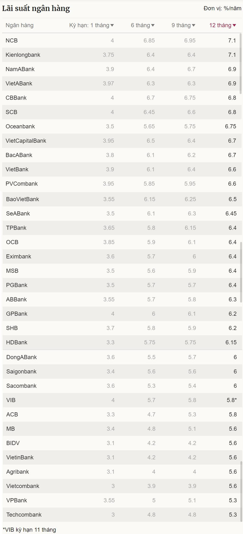 Các ngân hàng có vốn nhà nước và một vài ngân hàng tư nhân như ACB, VIB, VPBank, Techcombank, MB thậm chí chỉ yết lãi suất kỳ hạn một năm từ 5,3-5,8%.