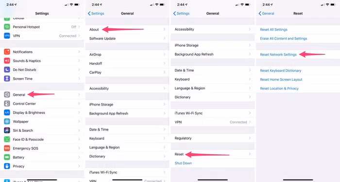 Cách thứ hai là đặt lại cài đặt mạng. Bằng cách đi đến Cài đặt > Chung > Đặt lại > Đặt lại Cài đặt mạng, thiết lập này sẽ đặt lại mọi mật khẩu Wi-Fi đã lưu, kết nối VPN...Sau khi xác nhận, điện thoại bạn sẽ tự khởi động lại.