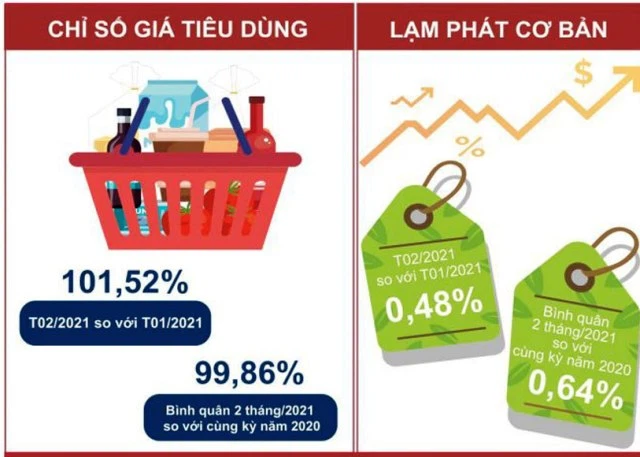 Tuy nhiên so với cùng kỳ năm trước, CPI tháng Hai chỉ tăng 0,70% – thấp nhất kể từ năm 2016 đến nay. Bình quân 2 tháng đầu năm 2021, CPI giảm 0,14% so với cùng kỳ năm trước. Lạm phát cơ bản tháng 02/2021 tăng 0,48% so với tháng trước và tăng 0,79% so với cùng kỳ năm trước. Lạm phát cơ bản bình quân 2 tháng đầu năm nay tăng 0,64% so với bình quân cùng kỳ năm 2020.