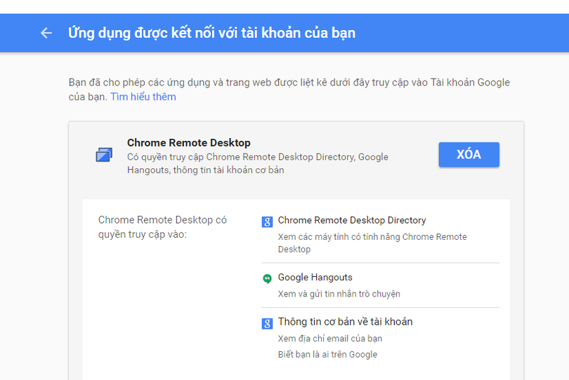 Hiện nay có nhiều dịch vụ và ứng dụng đòi hỏi kết nối tài khoản Google của bạn, nó sẽ yêu cầu nhiều thứ liên quan đến riêng tư như xem địa chỉ email, danh sách liên hệ,… Nếu cảm thấy không an toàn, bạn có thể xem xét và gỡ bỏ chúng ra khỏi tài khoản. Đây cũng là nguyên nhân dẫn đến vụ hack tài khoản Gmail qua Google Docs đề cập ở trên.