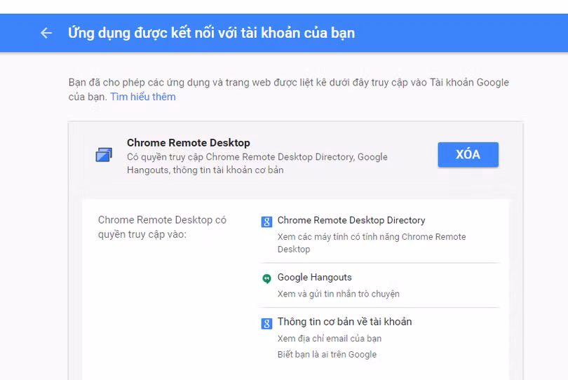 Bấm ảnh đại diện phía trên góc phải > Tài khoản của tôi > Đăng nhập và bảo mật > Ứng dụng và trang web đã kết nối > Quản lí ứng dụng. Sau đó, nó sẽ hiện ra các ứng dụng và dịch vụ có kết nối với tài khoản Google. Bạn bấm vào ứng dụng, để xem các yêu sách truy cập và nếu thấy quá can thiệp sâu vào tài khoản thì bấm Xóa để gỡ bỏ.