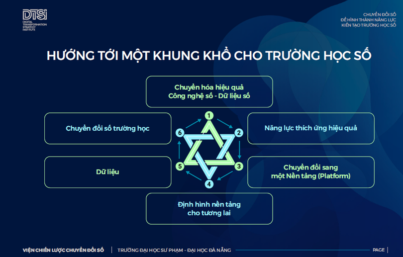 Để thực hiện chuyển đổi số tại trường Đại học sư phạm – Đại học Đà Nẵng nói riêng và chuyển đổi trong giáo dục và đào tạo nói chung, cần xây dựng một khung khổ chung cho trường học số tại Việt Nam dựa trên 6 chiều kích sau: Chuyển hóa hiệu quả Công nghệ số - Dữ liệu số; năng lực thích ứng hiệu quả; chuyển đổi sang một Nền tảng (Platform); Chuyển đổi sang một Nền tảng (Platform); Định hình nền tảng cho tương lai; Dữ liệu; Chuyển đổi số trường học.
